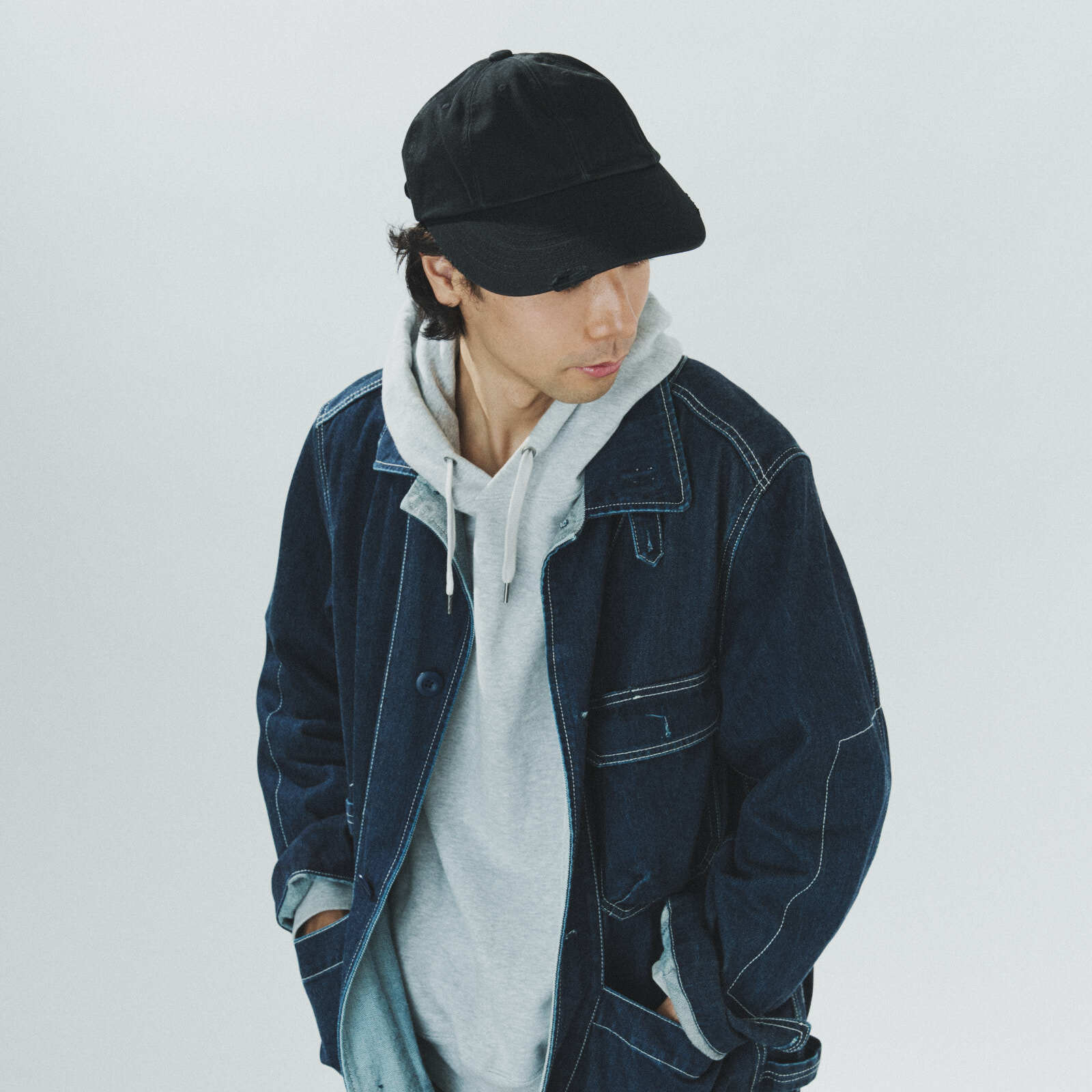 強い日差しや視線を遮るビッグバイザーは、物理的なプロテクションであると同時に、都市の喧騒から一歩退くためのスイッチでもあります。