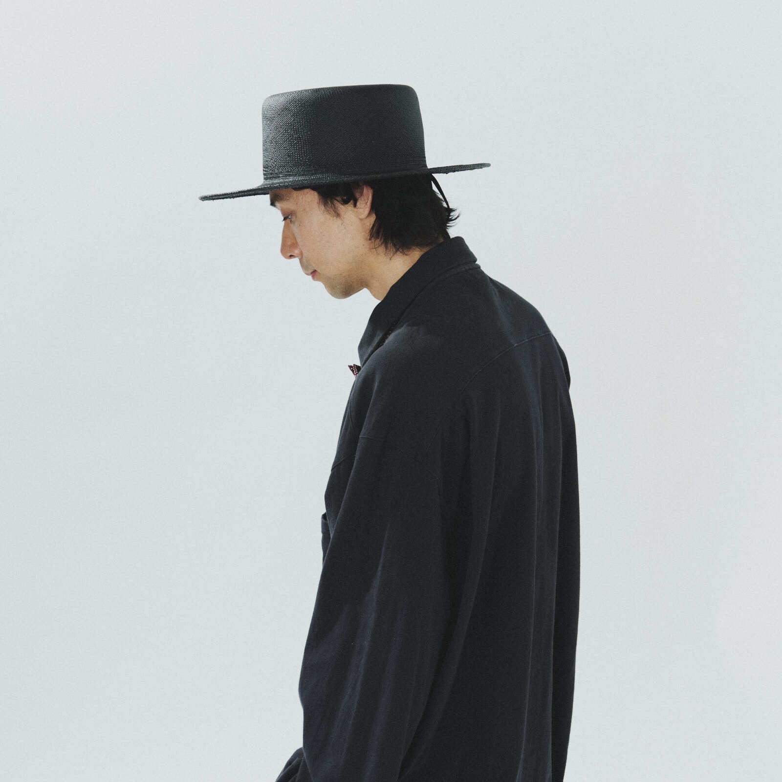 Traditionally, boater hats are crafted from hanamugi straw, a material that cannot be dyed black—making the creation of such a hat unattainable. The designer instead turned to the luxurious material of Panama. Yet, Panama’s softness posed a new challenge: how to achieve the stiffness characteristic of a true boater.